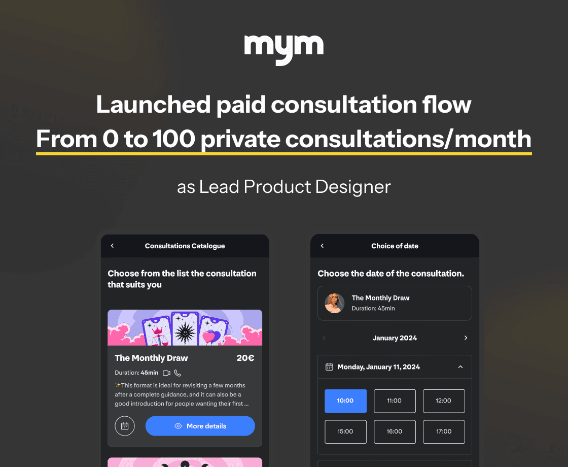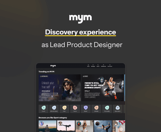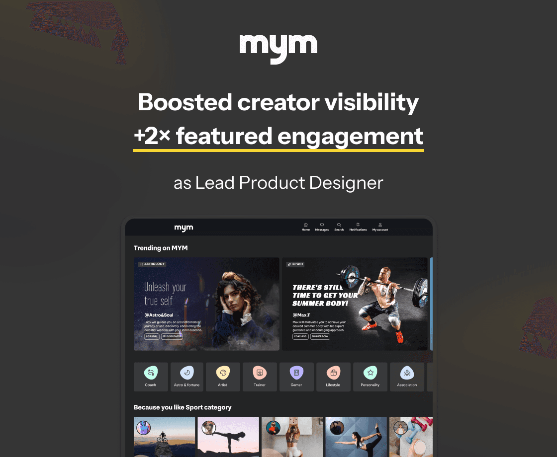 At MYM, led design on monetization, discovery & creator tools — driving revenue growth and design scale for a leading content platform.